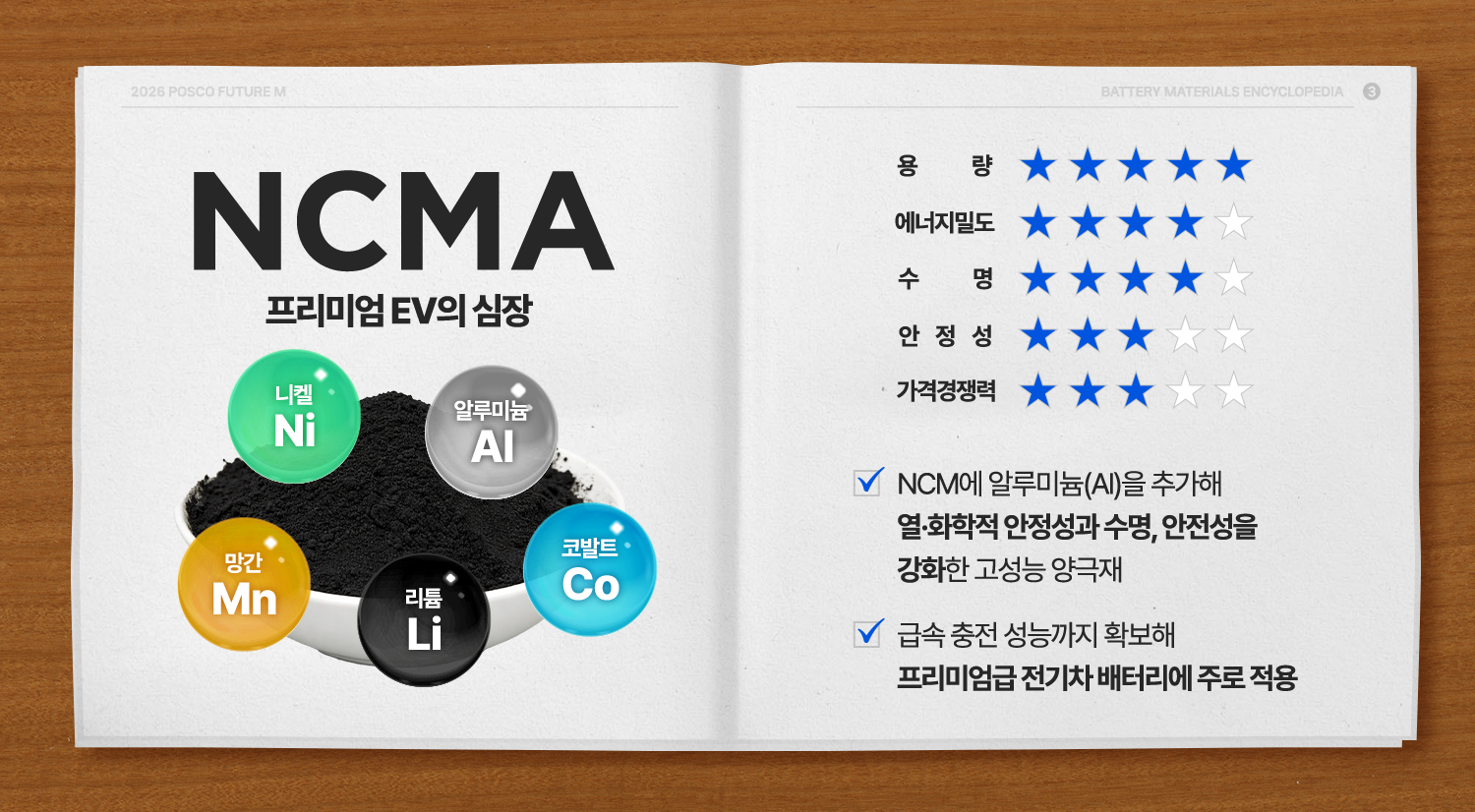 양극재는 니켈(Ni)ㆍ코발트(Co)ㆍ망간(Mn)ㆍ알루미늄(Al)ㆍ인산철(FePO₄)과 같은 금속 성분과 리튬의 조합으로 만들어지는데, 사용하는 금속과 그 비율에 따라 배터리의 용량, 에너지밀도, 안정성, 수명, 가격경쟁력이