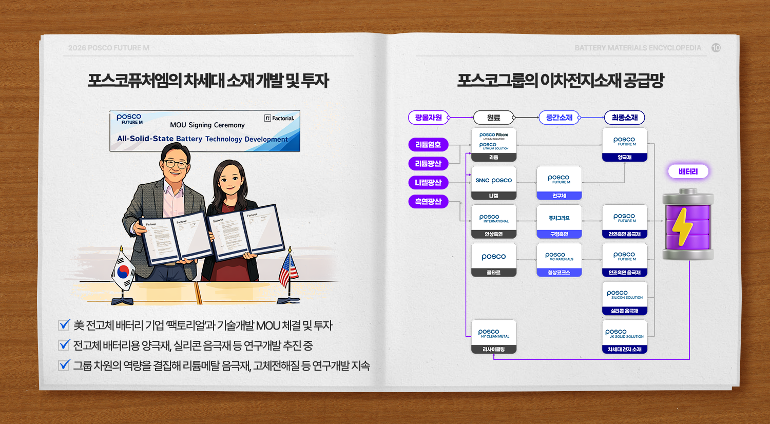 최근에는 미국의 전고체 배터리 기업 팩토리얼 에너지와 전고체 배터리 기술개발 MOU를 체결하고, 전고체 배터리용 양극재, 실리콘 음극재 등의 연구개발을 추진하는