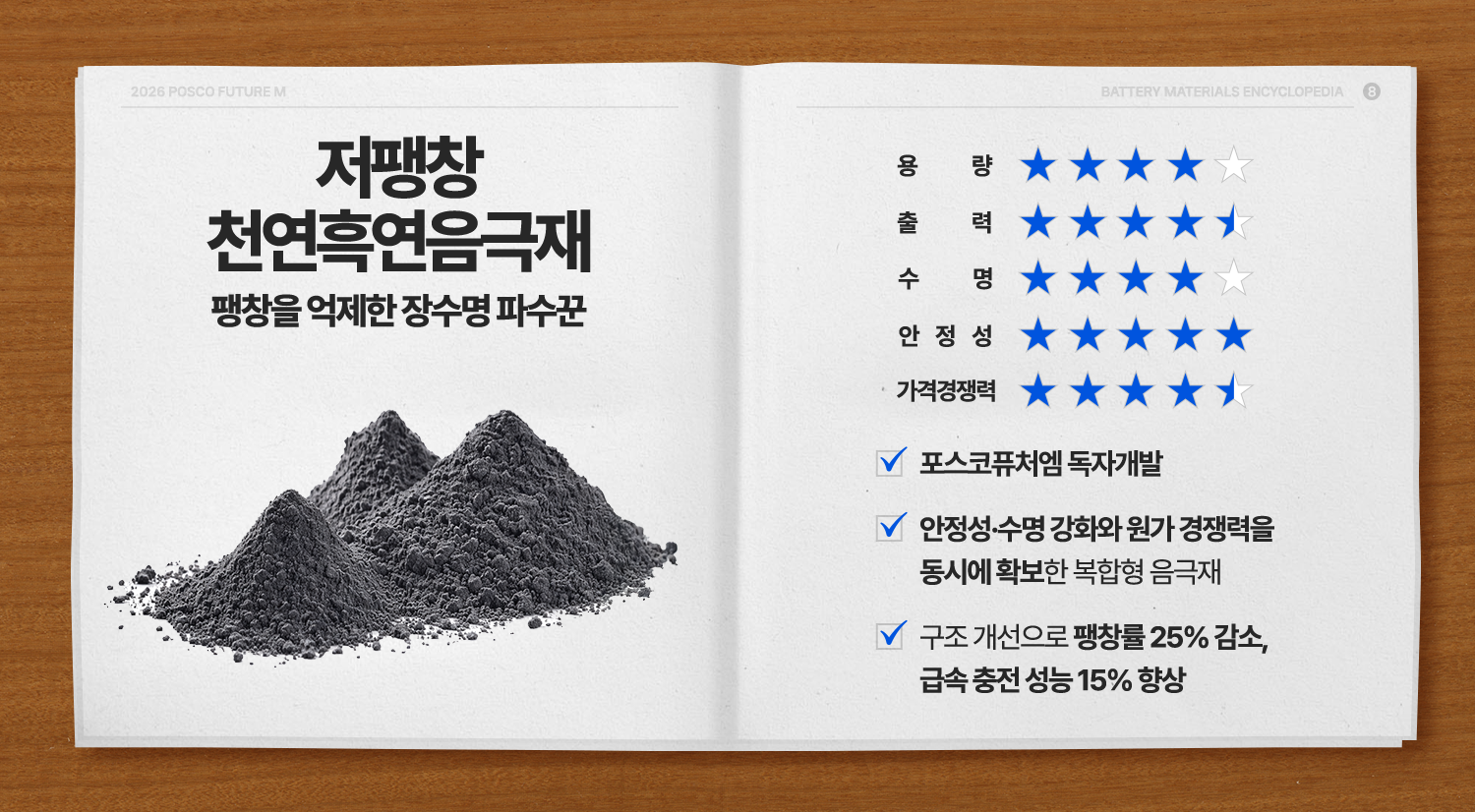 ○ 저팽창 천연흑연 음극재 – “팽창을 억제한 장수명 파수꾼”