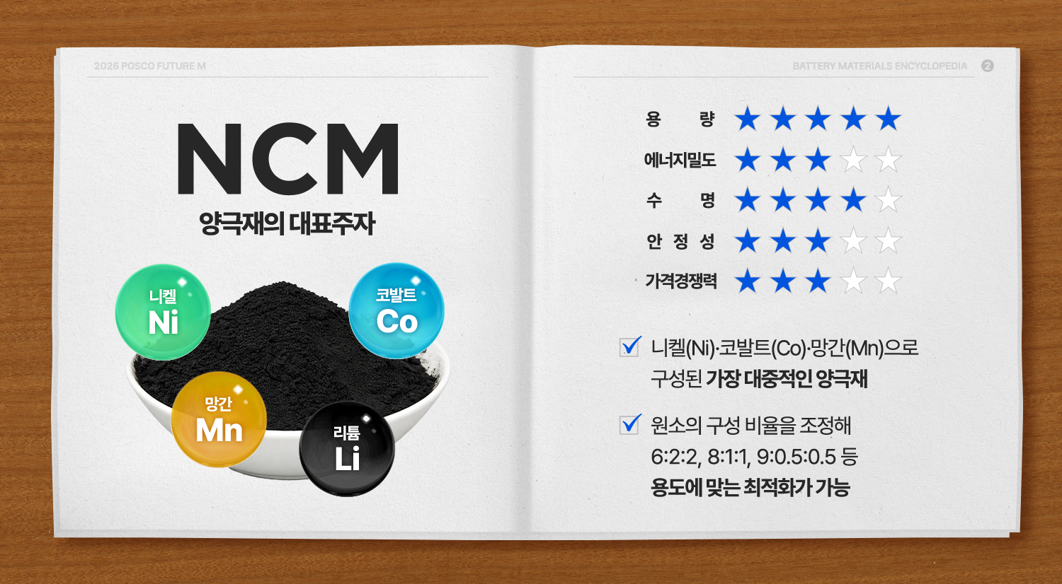 NCM 양극재는 니켈(Ni)ㆍ코발트(Co)ㆍ망간(Mn)으로 구성된 가장 대중적으로 사용되는 삼원계 양극재입니다.
