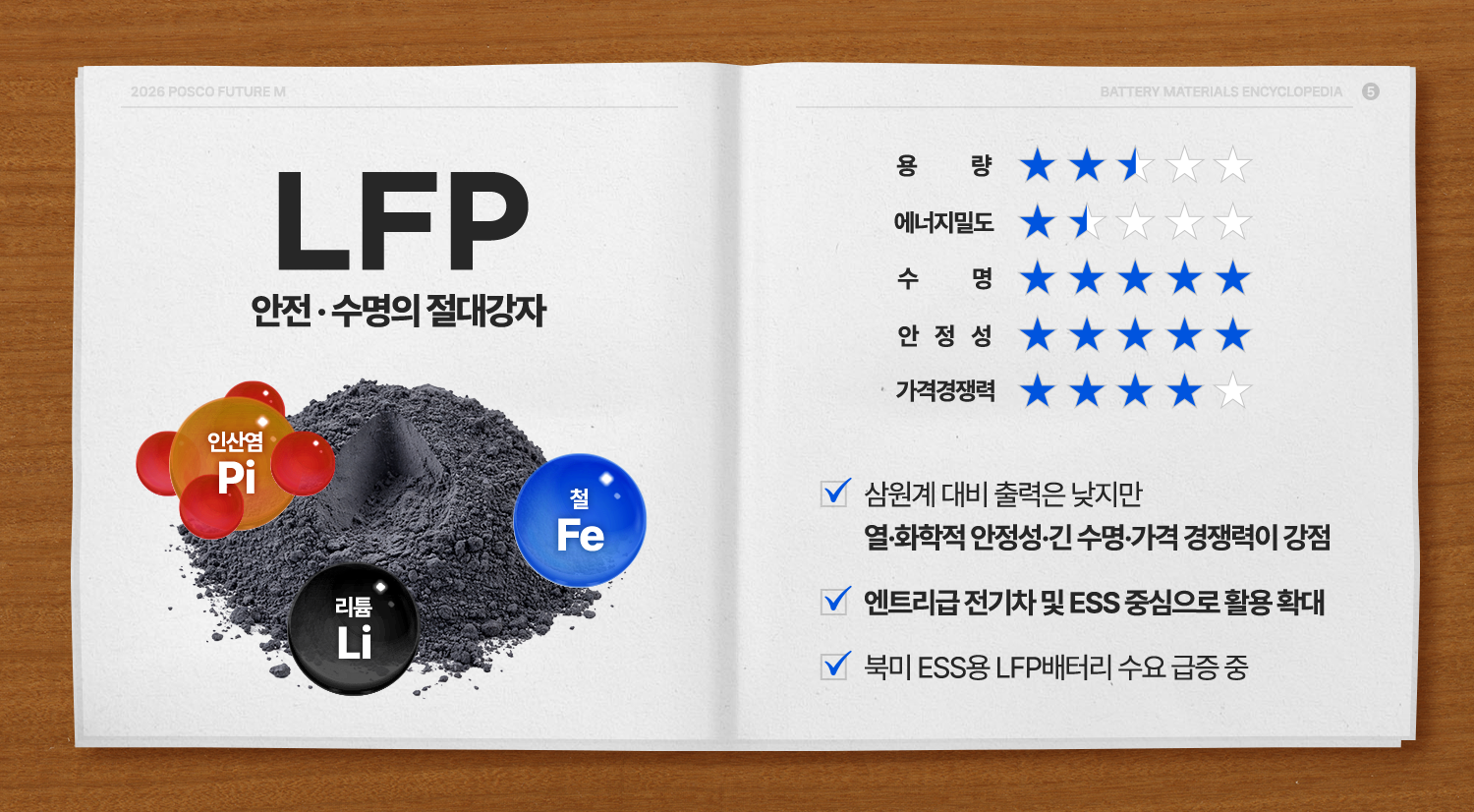 안정성이 높고 긴 수명과 저렴한 가격이 특징인 소재로, 주로 엔트리급 전기차와 ESS 등 다양한 분야에서 활용도가 높아지고 있습니다.