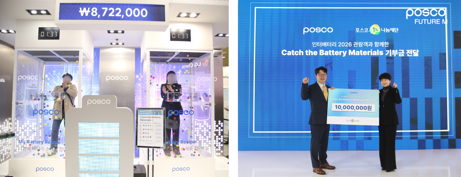 이번 인터배터리 2026의 포스코퓨처엠 부스는 포스코그룹의 배터리 소재 경쟁력을 살펴볼 수 있는 5개의 Zone 외에도 관람객들이 배터리 소재를 쉽게 이해하고 기부에도 참여할 수 있는 ‘캐치 더 배터리 머티리얼즈(Catch the Battery Materials)’ 이벤트도 진행했는데요.