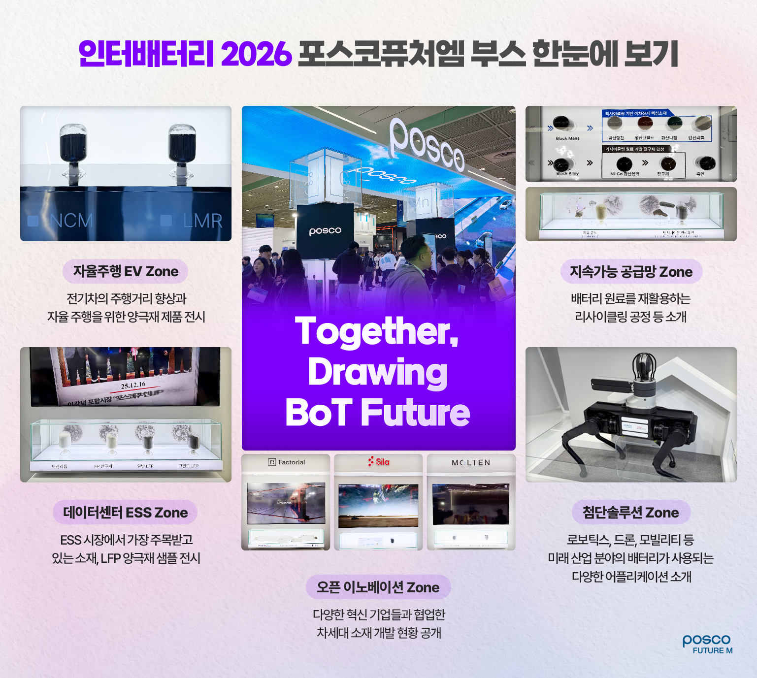 올해 포스코퓨처엠은 ‘Together, Drawing BoT* Future’를 주제로, 모든 사물이 배터리로 구동되는 미래 모습과 이를 위한 배터리 소재 기술을 생생하게 확인할 수 있도록 ▲자율주행 EV ▲데이터센터 ESS ▲Advanced Solution ▲Open Innovation ▲지속가능 공급망 등 5개의 존으로 전시부스를 구성했는데요.