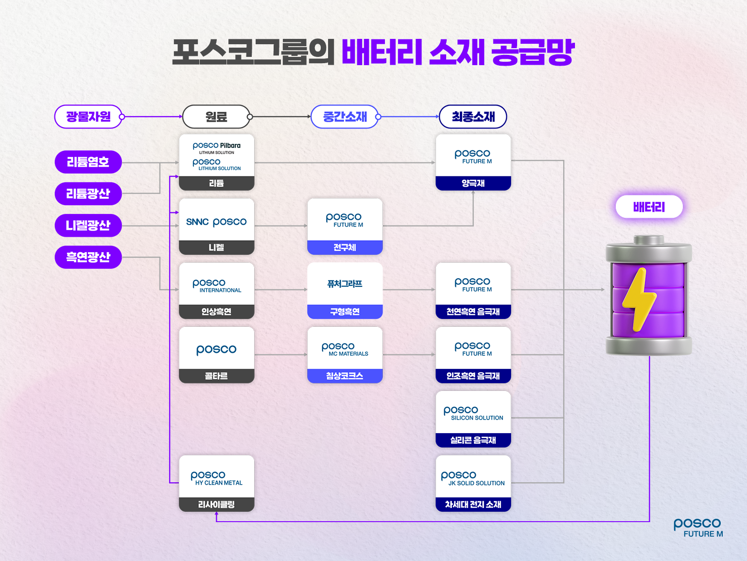 특히, 아르헨티나 리튬 염호, 호주 리튬 광산, 아프리카 흑연 광산과 같은 글로벌 우량 자원에 대한 포스코그룹 차원의 선제적인 투자를 지속하고 있고, 포스코퓨처엠은 포스코그룹이 투자한 리튬 공급망을 통해 양극재의 원료인 리튬을 공급받고 있습니다.