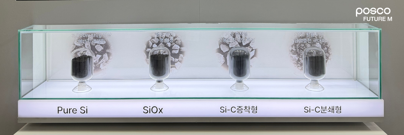 포스코퓨처엠은 이를 위한 실리콘 음극재 제품도 소개했습니다. 실리콘 음극재는 기존 흑연계 음극재 대비 저장용량을 최대 10배 높일 수 있고, 급속 충전 성능도 우수해 차세대 음극재로 주목받고 있는데요.