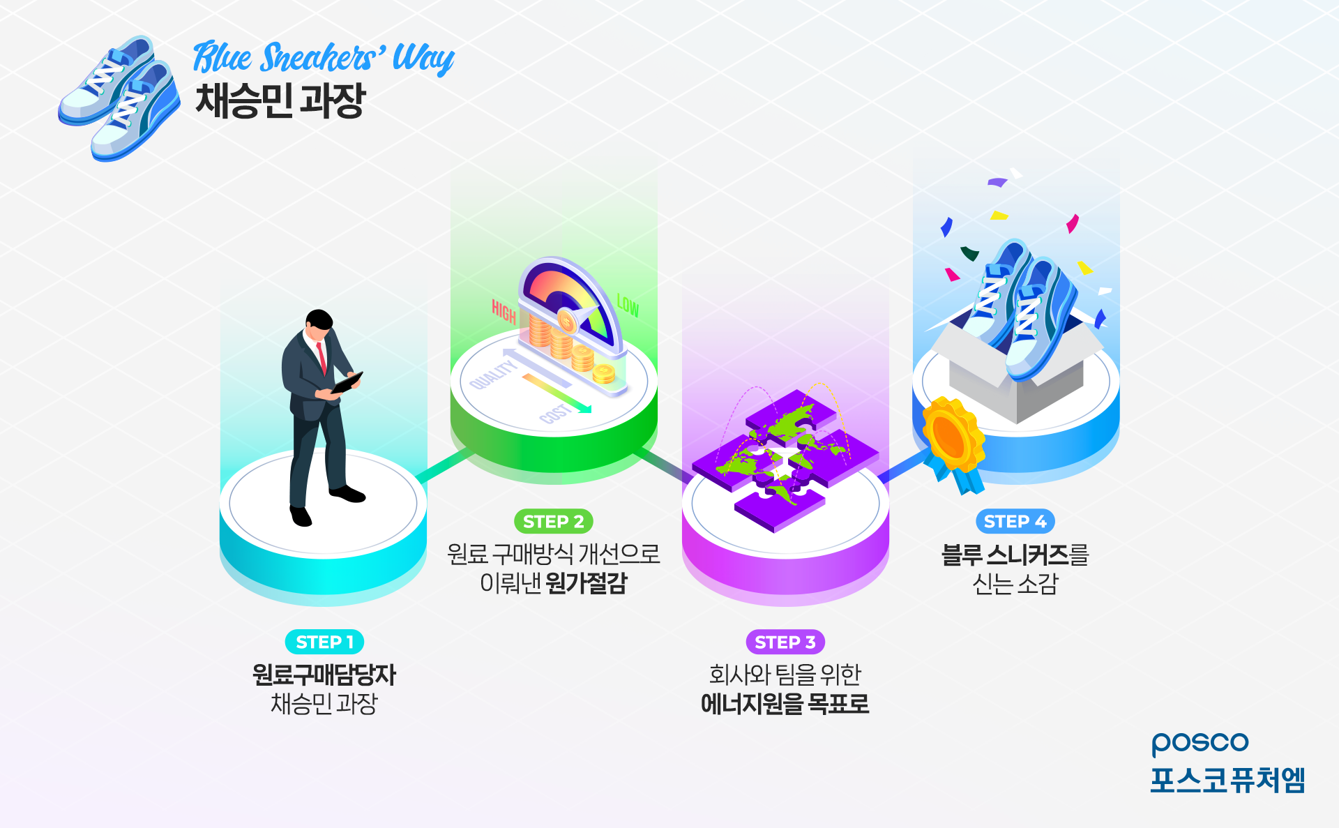 채승민 과장은 흑연 원료 구매방식을 경쟁입찰 방식으로 전환해 공급사를 다변화하고, 원가 경쟁력을 향상시킨 성과를 인정받아 블루 스니커즈에 선정되었는데요. 직접 채승민 과장을 만나 자세한 이야기를 들어볼까요?