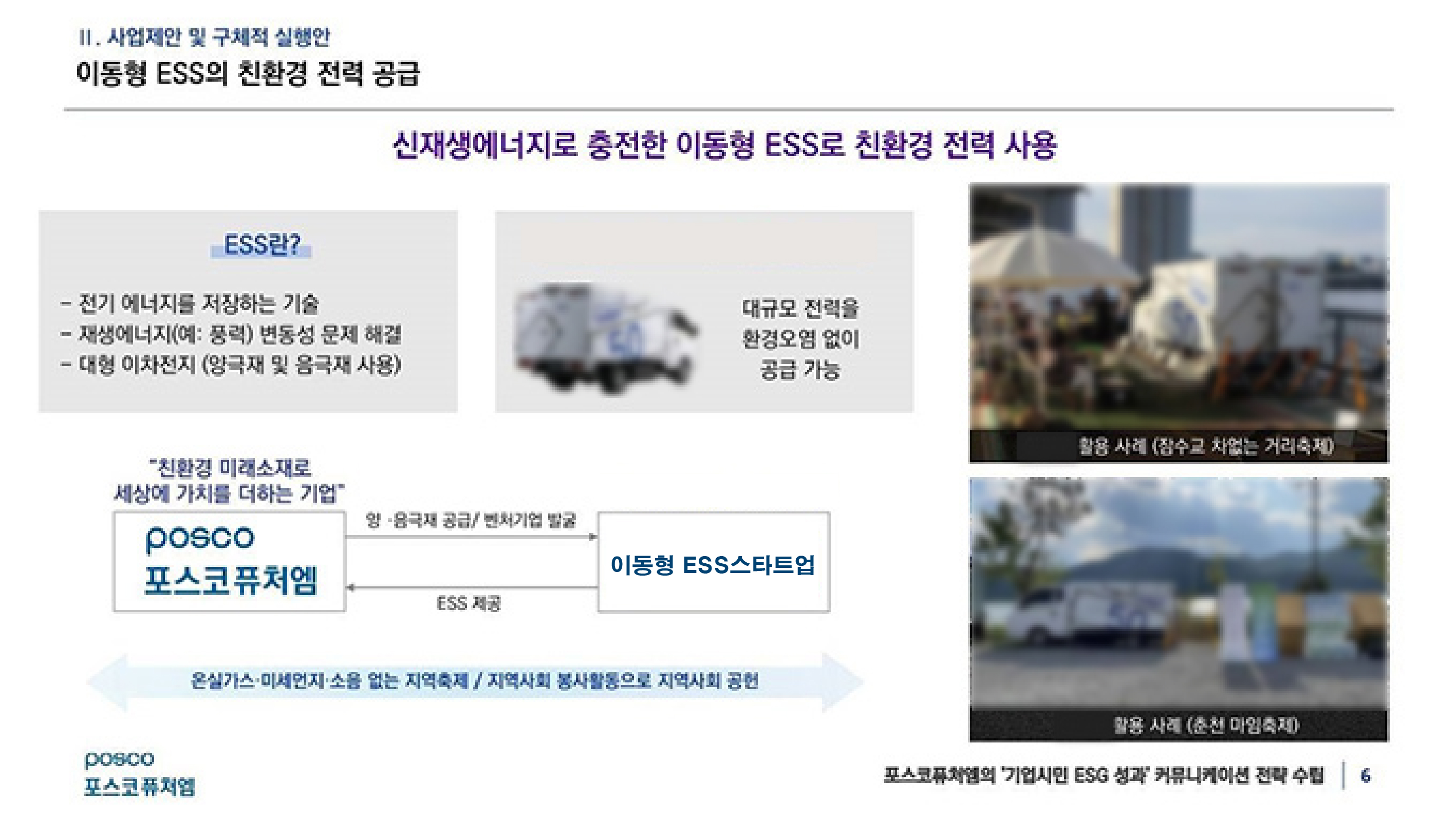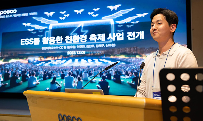 요즘 대학가에서 환경보호·사회책임·지배구조를 뜻하는 ESG가 핫하다는 소식을 들으셨나요? 관련 수업의 수강신청이 순식간에 마감될 정도로 ESG에 관한 대학생들의 관심이 높아지고 있는데요. 이에 포스코는 국내 17개 대학교에 기업시민경영과 ESG 과목을 개설하고, 임직원과 함께 하는 협업 프로젝트를 열어 ESG 시대 기업시민형 인재를 양성하고 있습니다. 마지막 편에서는 ESS(Energy Storage System, 에너지저장시스템) 기술을 활용해 친환경 축제 사업 아이디어를 발굴해 낸 포스코퓨처엠과 한양대학교 HY-CC팀의 이야기를 소개합니다.