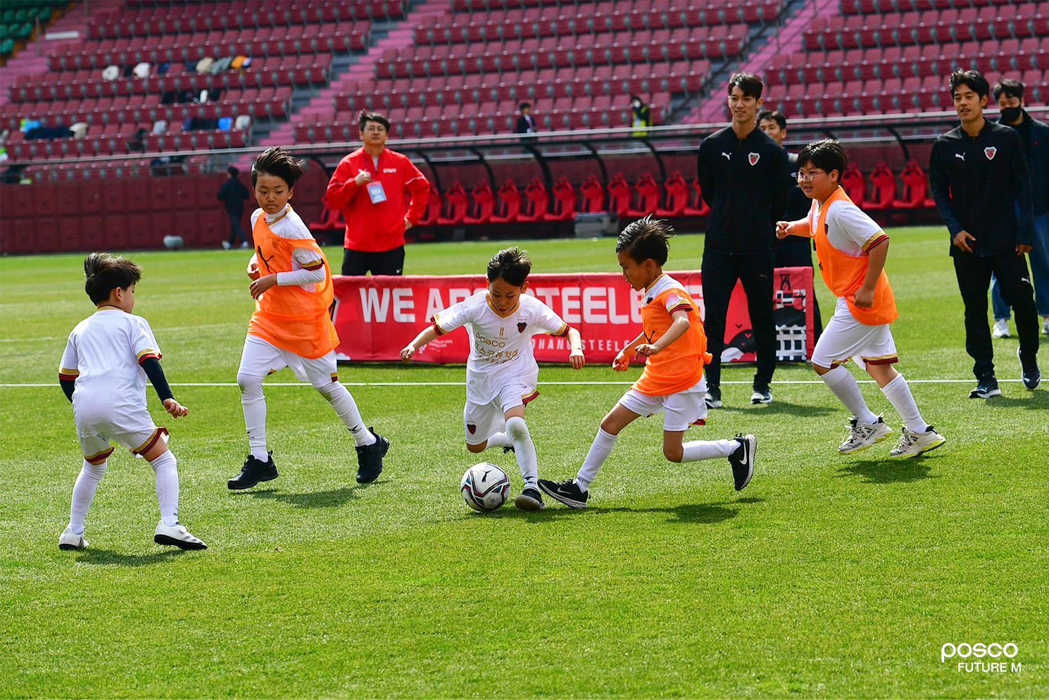 포스코퓨처엠은 포항스틸러스와 함께 포항 지역 아동센터 8곳 어린이 총 50명을 대상으로 축구교실을 운영하고 있습니다. 포스코퓨처엠은 어린이들의 기초체력과 협동심을 기르고 K리그 관람 등 스포츠 문화 체험 기회를 제공하기 위해 포항스틸러스와 함께 축구교실을 기획했습니다.