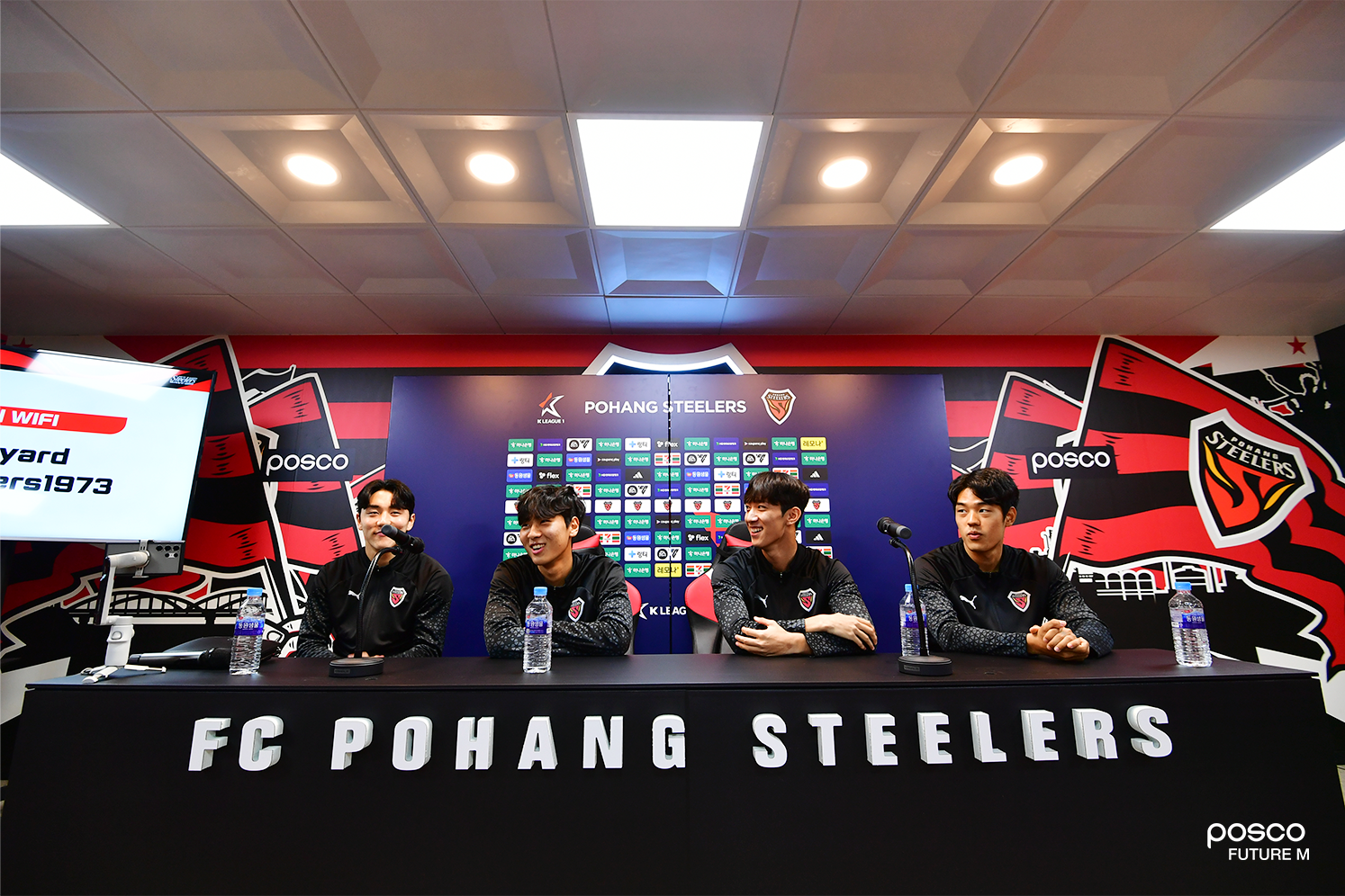 이어서 선수 및 감독 인터뷰를 진행하는 미디어룸을 견학했는데요, 이때 포항스틸러스의 윤재운 김준호, 강현제, 윤석주 선수가 깜짝 등장했습니다. 어린이들은 영상으로만 보던 선수들을 직접 보자 탄성을 자아내며 박수로 선수들을 반겼습니다. 한 어린이가 “누가 제일 축구를 잘해요?”라고 묻자 윤재운, 김준호, 강현제, 윤석주 선수는 각자 본인을 손가락으로 가리켜 어린이들의 웃음을 자아냈습니다.