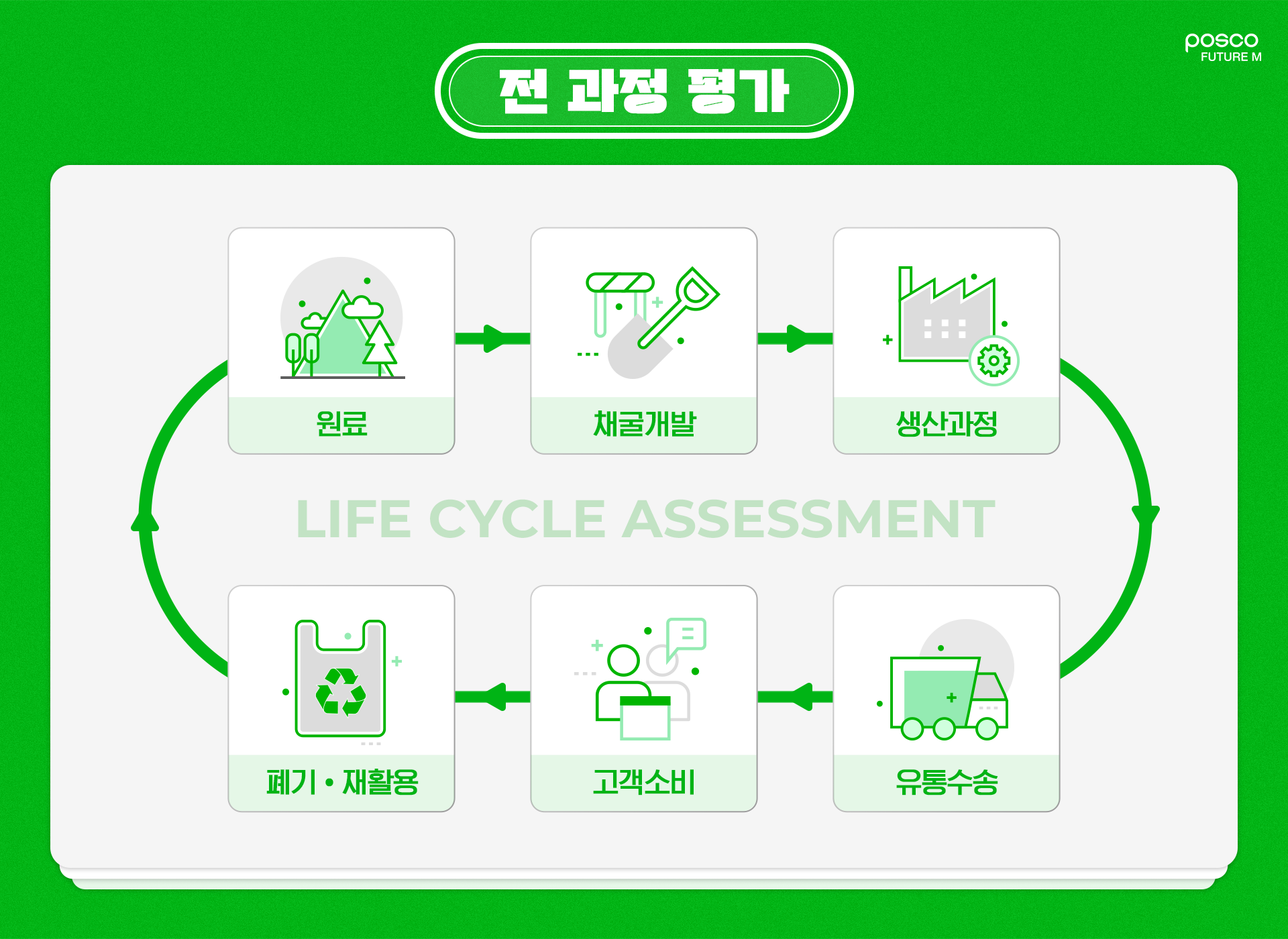 포스코퓨처엠은 국제표준에 맞춰 제품의 원료 채굴부터 생산, 수송·유통, 사용, 폐기 등 전과정 평가(LCA, Life Cycle Assessment)를 실시하고 있습니다. 특히, 환경영향을 계량화하기 위해 리튬, 니켈 등 핵심 원료의 채굴, 정·제련 과정에서 발생하는 환경측면을 명확히 파악하는 것이 중요하기 때문에, 포스코퓨처엠은 국내외 원료 공급 회사들과 지속적인 커뮤니케이션을 통해 심사 기준에 부합하는 수치 확보에 노력을 기울이고 있습니다.