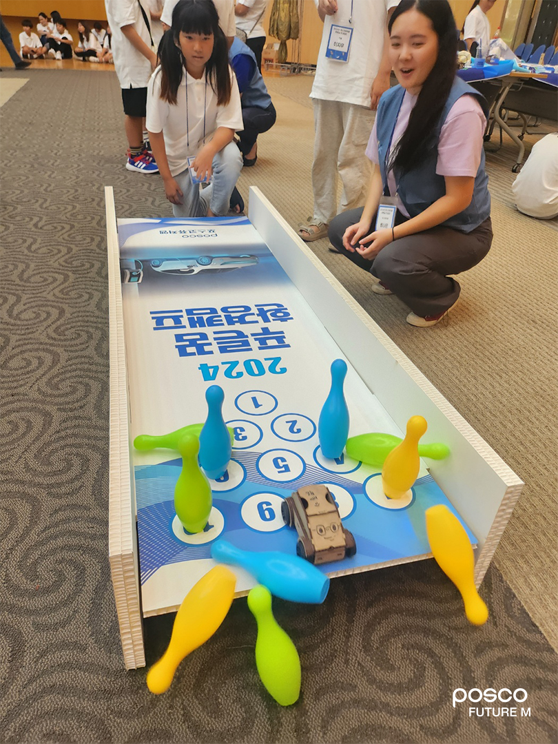포스코퓨처엠이 생산하는 양·음극재 등 배터리 기본 구성요소와 작동 원리, 이산화탄소를 배출하지 않는 전기차의 장점에 대해서도 공부하고, 직접 제작한 전기차 모형을 활용해 전기차 볼링 등 체험학습도 병행합니다.