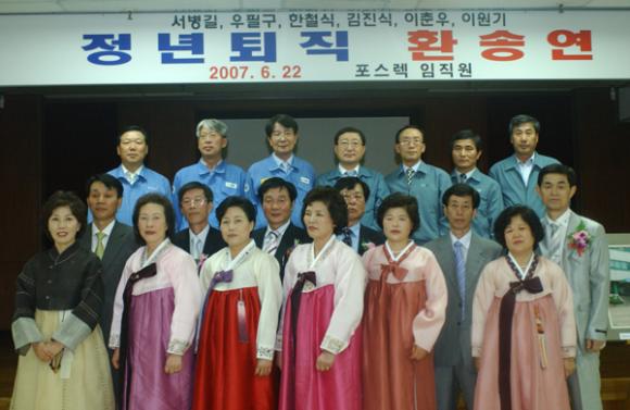 포스코 종합로재 전문 계열회사인 포스렉(사장 이상영)은 6월 22일 15시 30분부터 본사 강당에서 상반기 퇴직 환송연 행사를 개최하였다. 이날 행사에는 이상영 사장을 비롯하여 임원과 노동조합위원장, 직원, 정년 퇴직자 가족 등 100여명이 참석하여, 그간 회사 발전을 위해 헌신적인 노력을 다하고 회사를 떠나는 퇴직자들에게 감사와 앞날의 무궁한 발전을 기원하는 환송회를 가졌다. 행사 내용은 퇴직자 소개, 이상영 사장의 건배 사, 축가, 공로 패 수여, 기념품 전달, 꽃다발 증정, 기념촬영 순으로 진행되었다. 금번 퇴직자는 6명인데, 생산본부 서병길씨, 마그네시아 생산과 우필구씨, 노재정비1과 한철식씨, 노재정비1과 김진식씨, 노재정비1과 이춘우씨, 노재정비2과 이원기씨이다. 생산본부 서병길씨는 POSCO에서 22년 동안 재직 후, 1999년 10월 포스렉에 입사하여 7년 8개월을 근무하였으며, PI/ERP추진실장을 역임하면서 회사 통합 전산망 구축에 크게 기여하였다. 마그네시아생산과 우필구씨는 1976년 8월에 입사하여 30년 10개월을 재직하면서 클린커 생산에 주역을 담당하였다. 노재정비1과 한철식씨(1974년 10월 입사, 32년 8개월 재직), 노재정비1과 김진식씨 (1976년 8월 입사, 30년 10개월 재직), 노재정비1과 이춘우씨 (1979년 2월 입사, 28년 4개월 재직), 노재정비2과 이원기씨 (1978년 8월 입사, 28년 10개월 재직)는 축로분야의 산증인으로서, 배테랑 축로기능인으로서 축로분야 발전에 크게 기여하였다. 이상영 사장은 “그동안 우리회사 발전을 위해 열정과 정성을 다한 퇴직자들의 노고를 치하하고, 정년 퇴임식을 맞이하게 된 것을 축하드립니다. 앞으로 제2의 인생을 위해 더욱 매진하시고, 가족의 건강과 행복을 기원합니다. 특히 오늘에 있기까지 물심양면으로 내조해주신 퇴직자 사모님께 감사드립니다.”라면서 건배 제의를 하였다. 이상영 사장의 건배 사 후, 퇴직자를 대표하여 서병길씨가 “포스렉과 함께 한 지난날이 주마등처럼 지나가고 오늘 퇴직을 맞이하게 되니 만감이 교차합니다. 그동안 물심양면으로 도와주신 사장님과 임원 그리고 동료 여러분들에게 감사드립니다. 앞으로 포스렉이 영원히 성장 발전하기를 기원합니다.”라고 답사를 하였다. POSCO 중창 동아리팀이 “꿈길에서”, “축배의 노래”,“희망의 나라로”를 열창