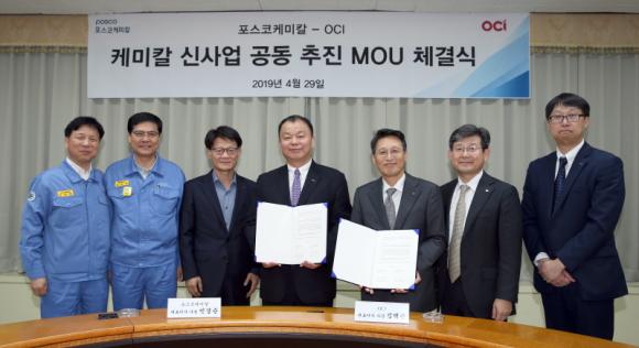 포스코케미칼은 29일 14시, 포스코케미칼 포항 본사에서 OCI 김택중 사장과 민경준 포스코케미칼 사장이 참석한 가운데 양사간 제철부산물을 활용한 화학 사업 분야에서의 전략적인 협력과 합작법인 설립 추진 등을 위한 양해각서(MOU)를 체결했다.