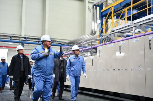 ▲(사진설명) 포스코켐텍이 세종시 전의산업단지 내 음극소재사업소에 2차전지 음극재 공장 6, 7호기를 증설하고 본격 가동에 들어갔다. 27일 오전 진행된 준공식에서 포스코켐텍 최정우 사장(가장 오른쪽)을 비롯한 참가자들이 증설된 설비를 투어하고 있다.